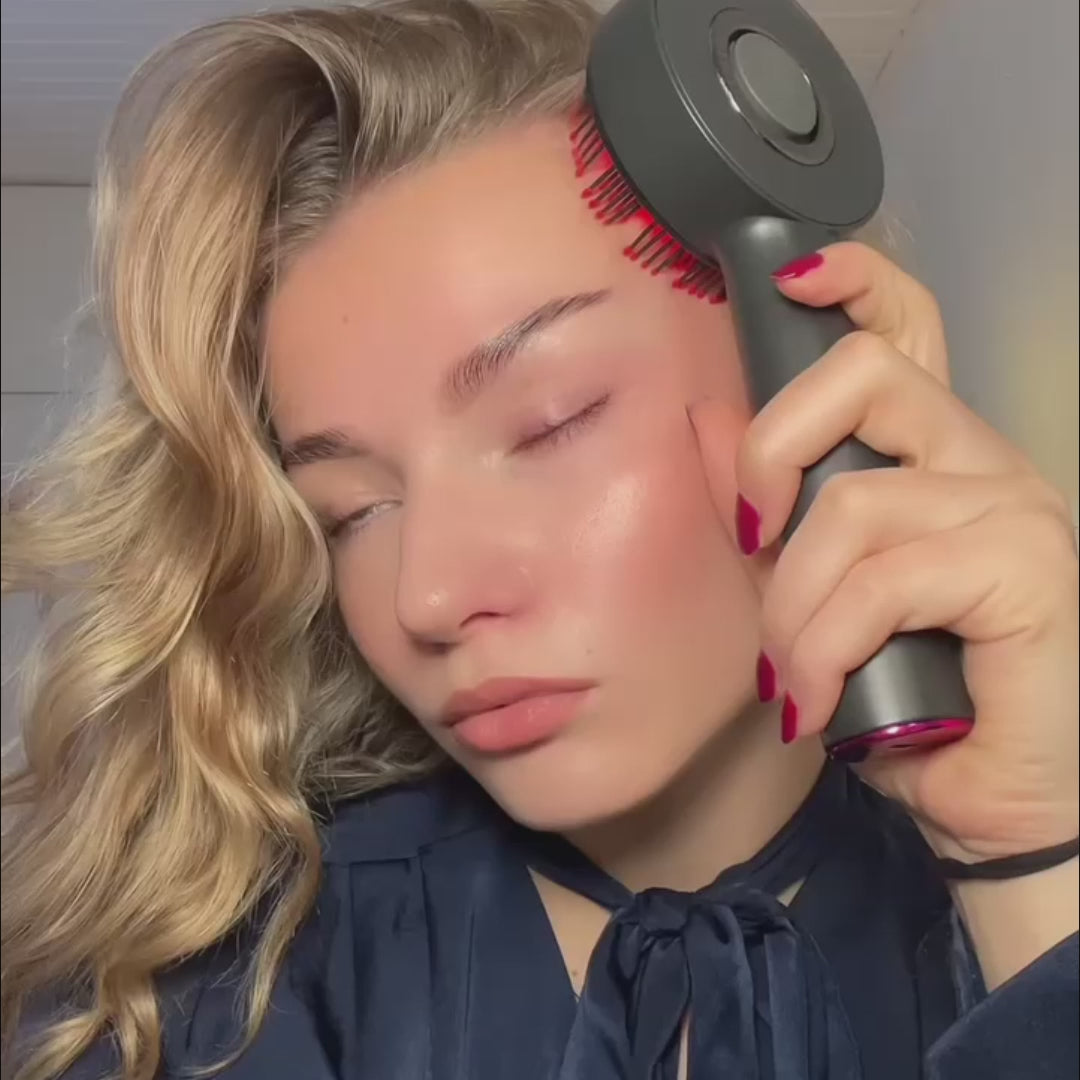 Lunova™ Glow Masažni Češalj kombinira crvenu LED terapiju i masažu za jači korijen, opušteno tjeme i gušću, zdraviju kosu.